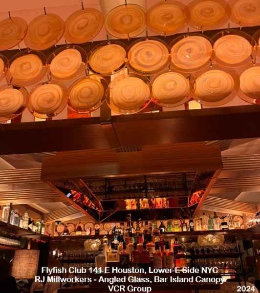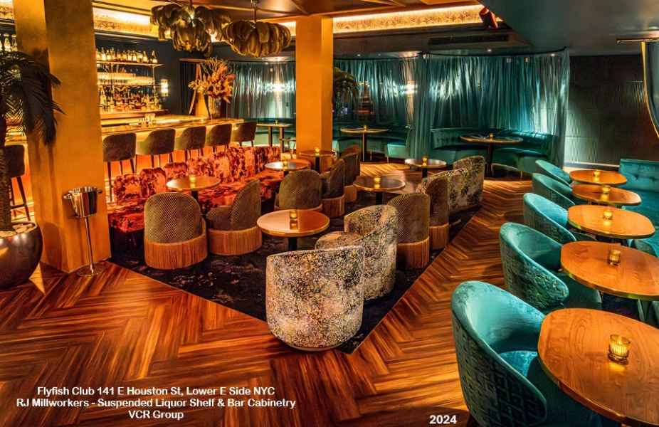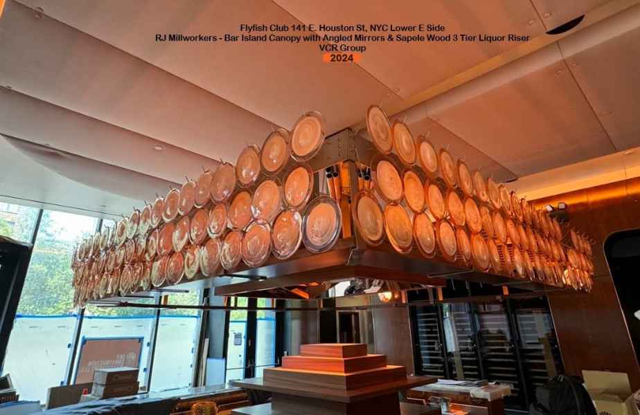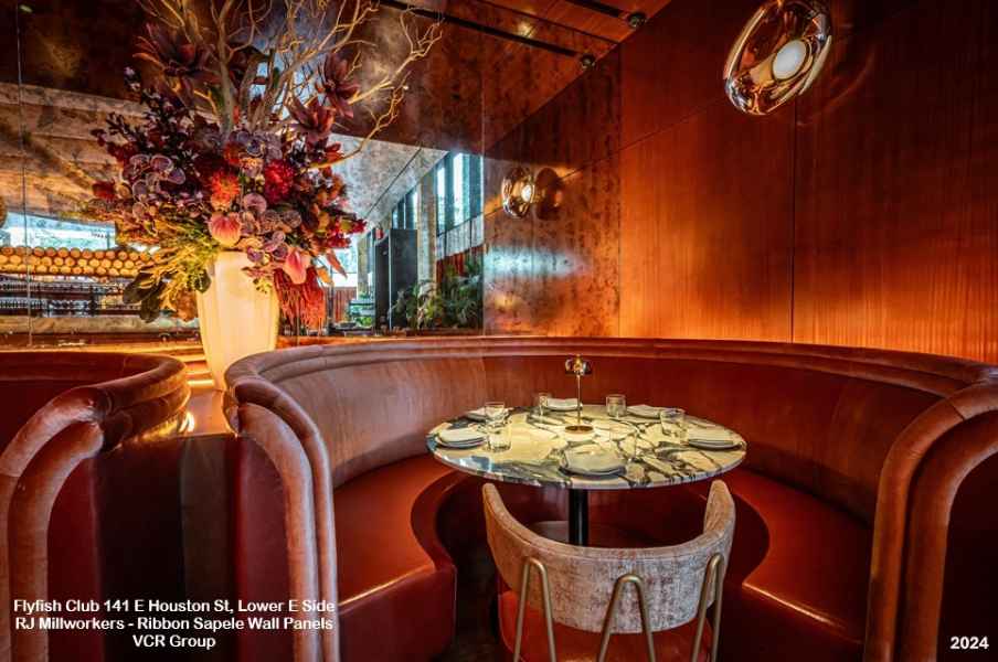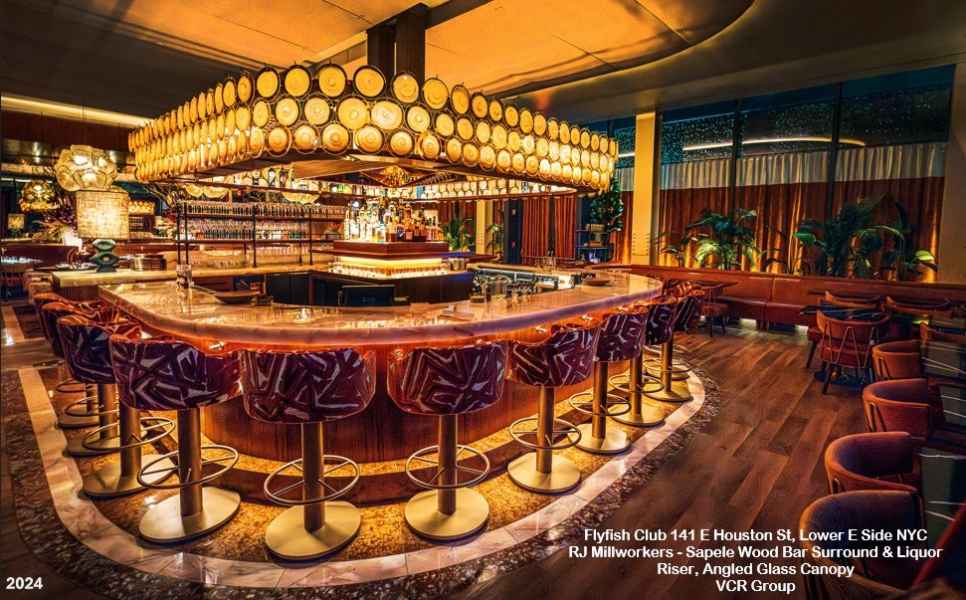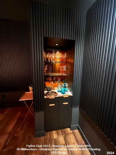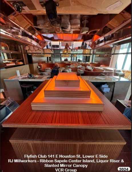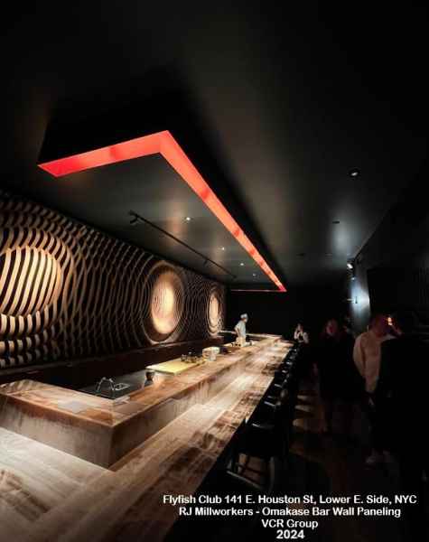 - Underwater themed inspired Restaurant & Bar. White Oak Tambour Wall Paneling Teal Finish, Ribbon Sapele, Suspended Liquor Shelving, Bar Island Canopy with angled Mirrors, Liquor Riser, Cabinetry, Fenix Nero Ingo Panels, Floating Shelves, Oak Acoustic Wall Paneling and Sapele Pommele Bar Wall Paneling, Omakase Bar Brown Anigre Wall Paneling & Matte Midnight Blue Wall Slats.