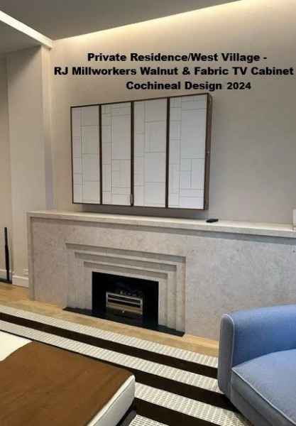 - Walnut TV Cabinet with Bi-folding Doors, Brass Van Morris knuckle hinges, Piano Hinge and door pull, Doors wrapped with natural fiber wall covering