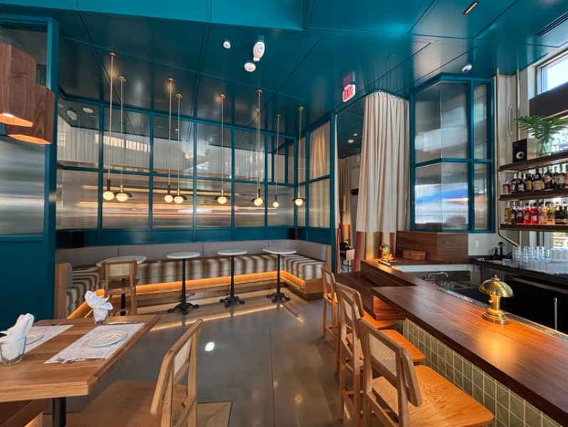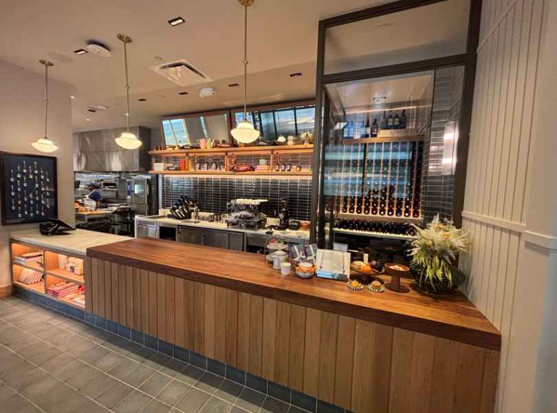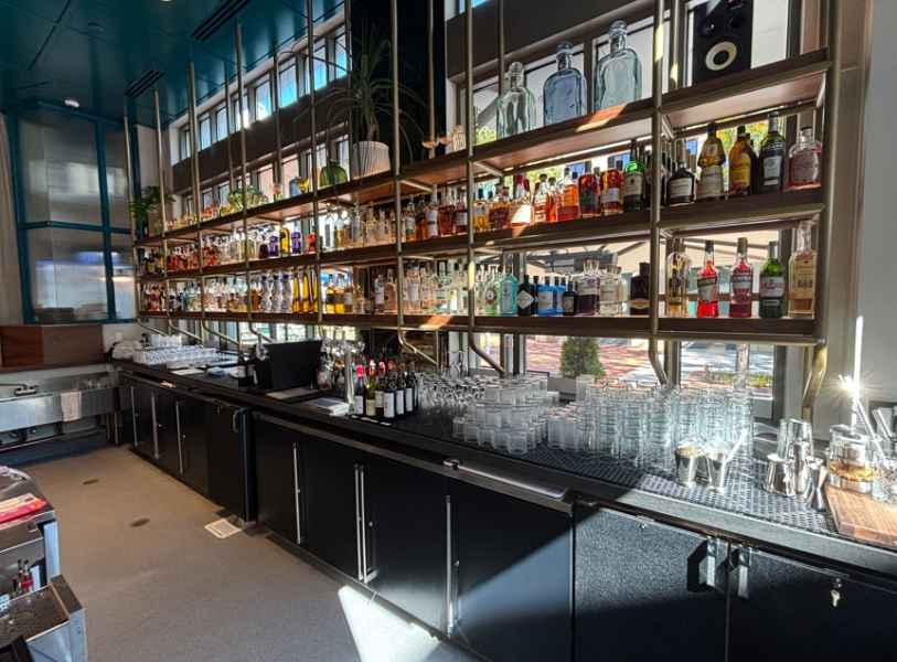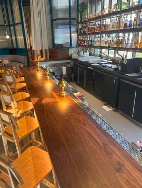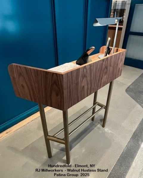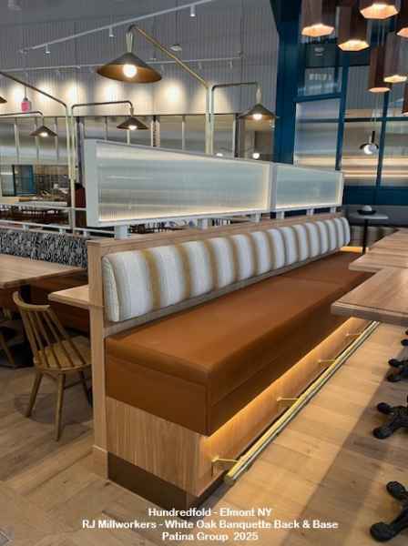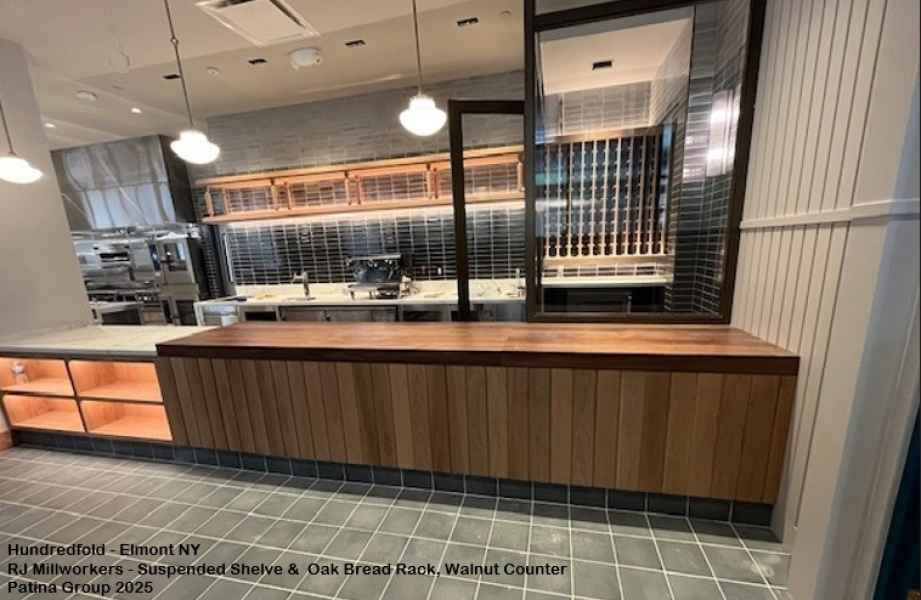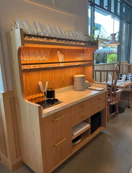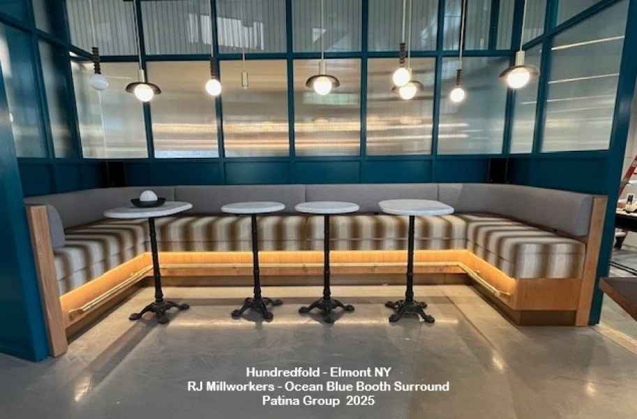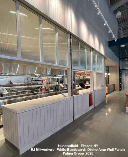 - Walnut Host Stand, Fireplace enclosure, Oak Countertop, White beadboard & Wall Planking, Server Station, Recessed Wall Cabinet, Pacific Blue Beadboard & Booth Walls, Dining Banquette Walls, Bar, Custom wine rack & welding for backbar suspended shelving and trim throughout.