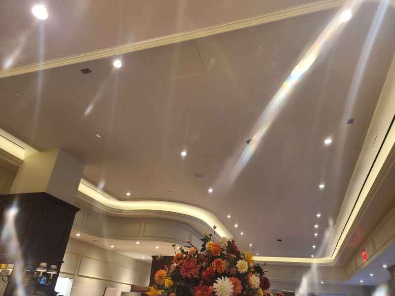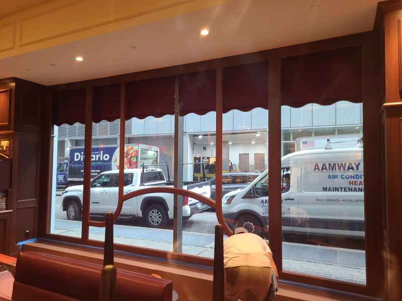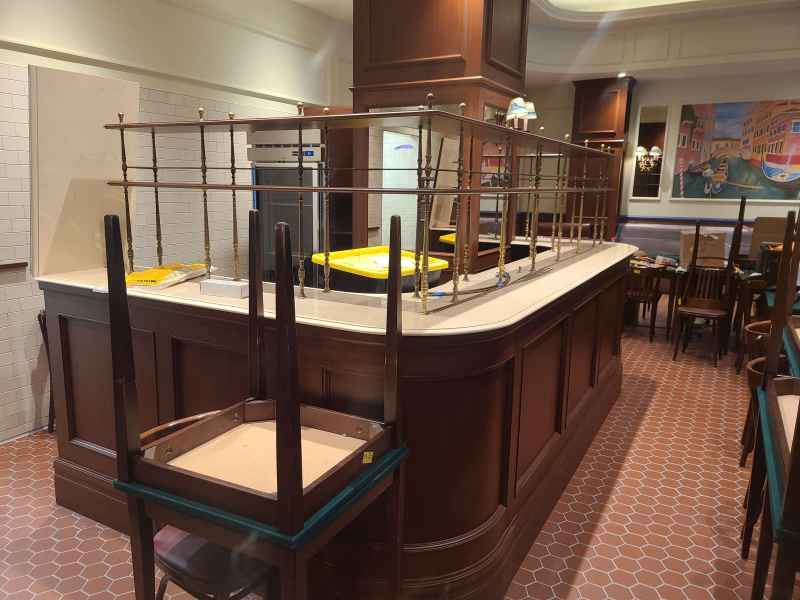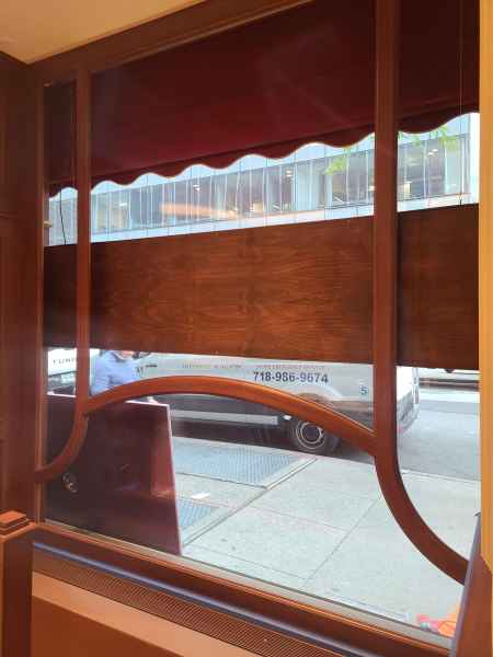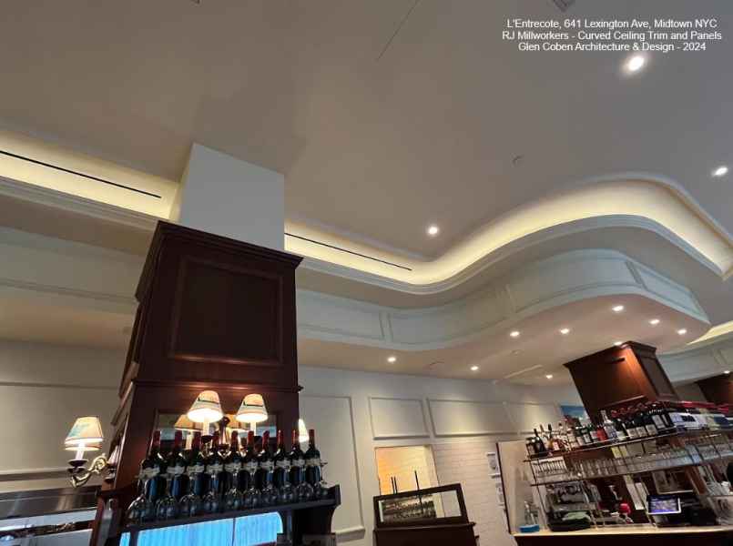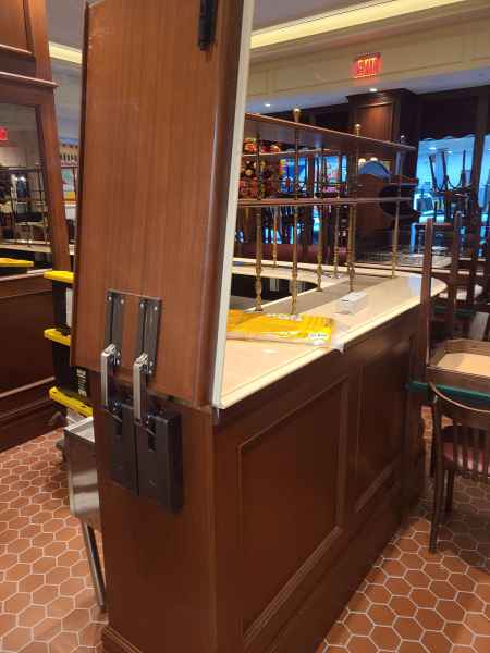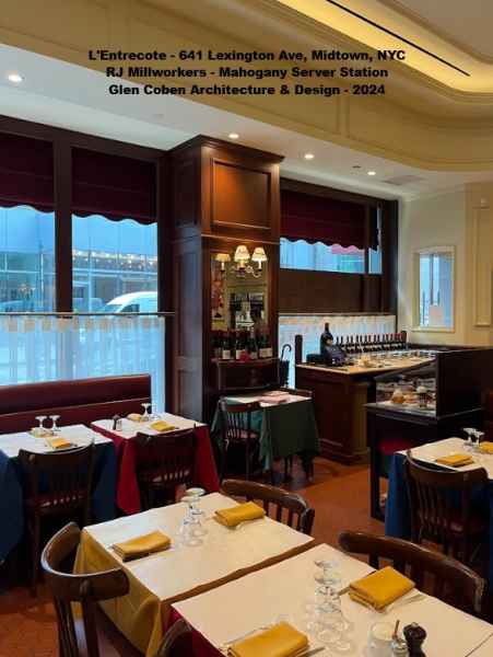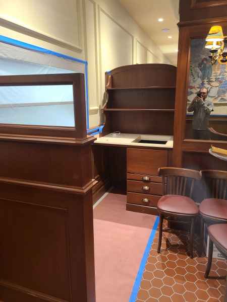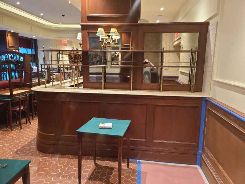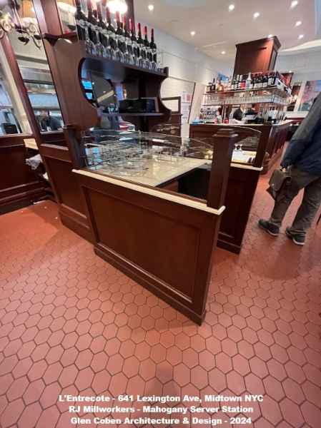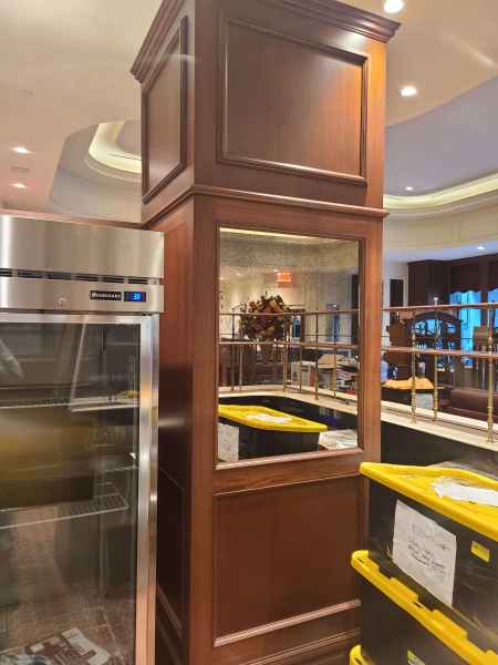 - Stained Mahogany Wood Paneling, Gold Antique Mirrors, Astragal Molding, Mahogany Counter trim, Shelving, Beveled mirrors, Mahogany Base cabinets, Trolley on casters, Crown molding, trim throughout and Mahogany Doors.