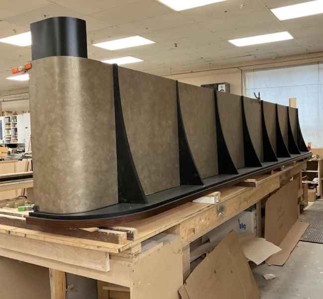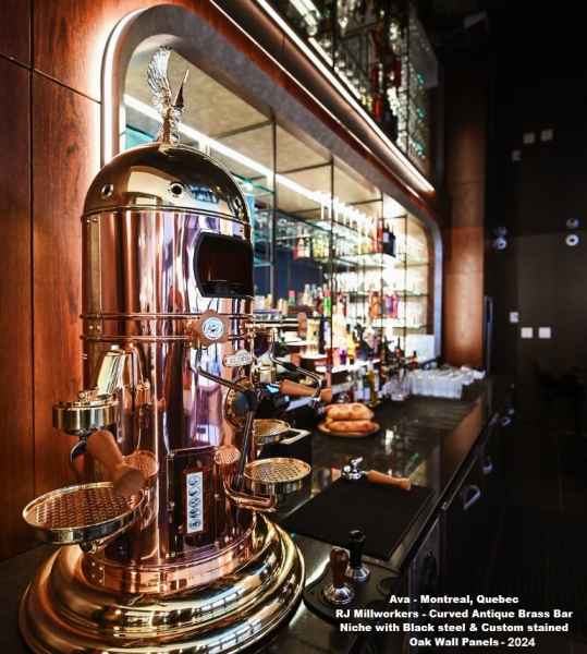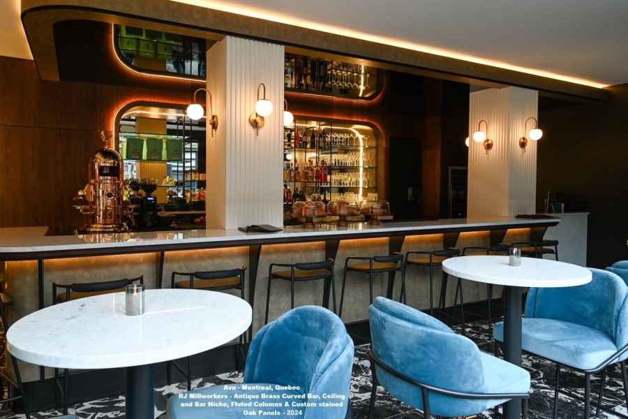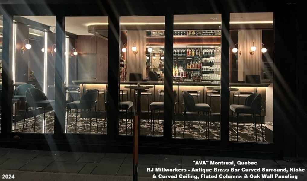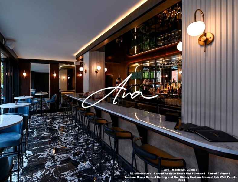 - Antique brass Curved Bar Wall panels, Arched Bar Niche with Metal laminate surround, black square tube steel posts and shelving for Liquor bottles, Stained White Oak Wall Paneling throughout, White fluted columns, Antique brass with black accent Perimeter ceiling