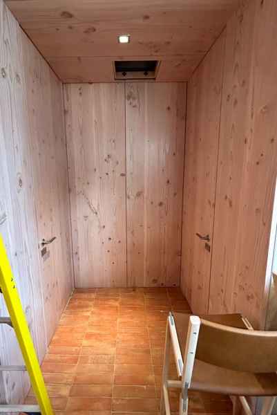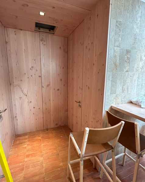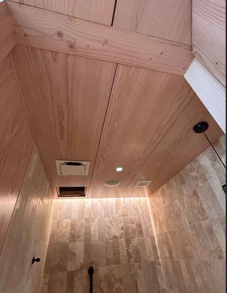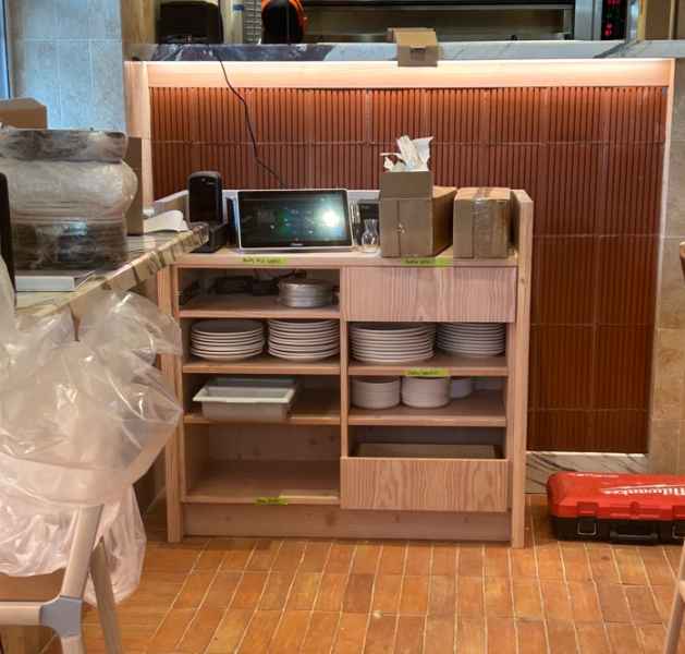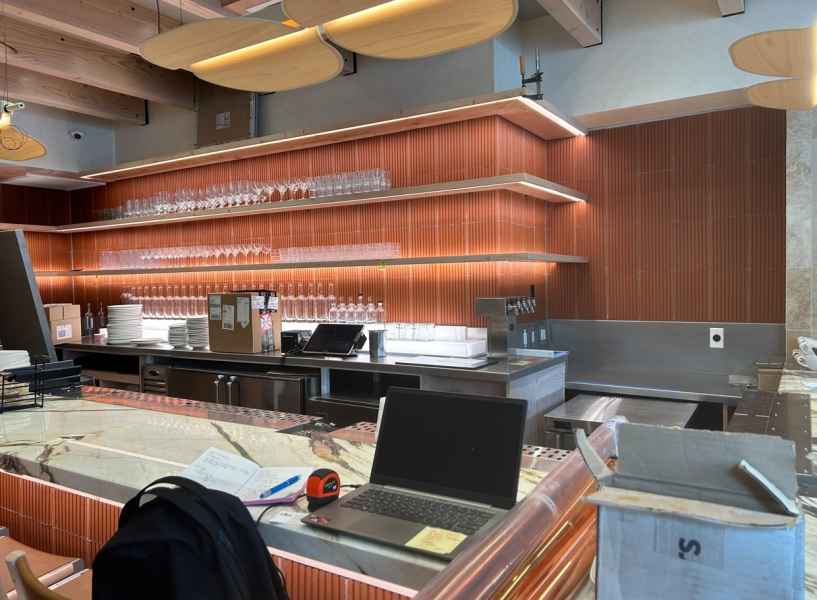 - Custom color match using lye chemicals on Douglas fir, yielding a soft pink whitewash finish for ceiling, walls, custom doors, Suspended Bar shelves, server station & full-Length columns.
