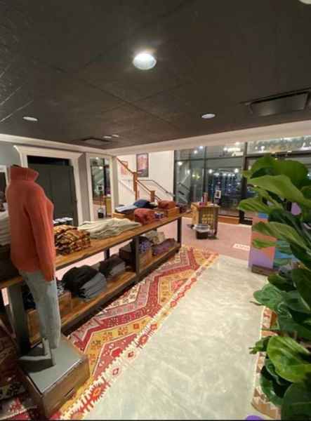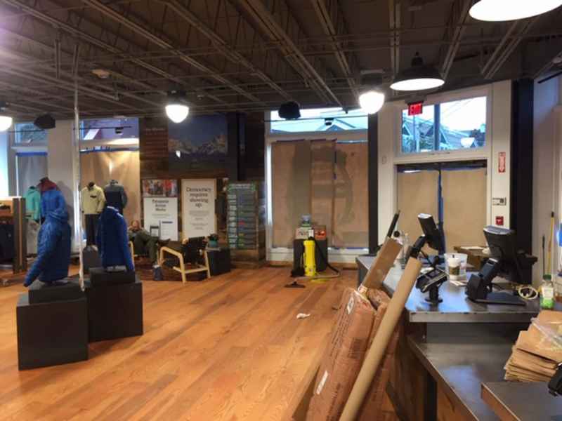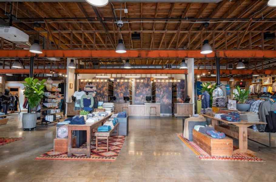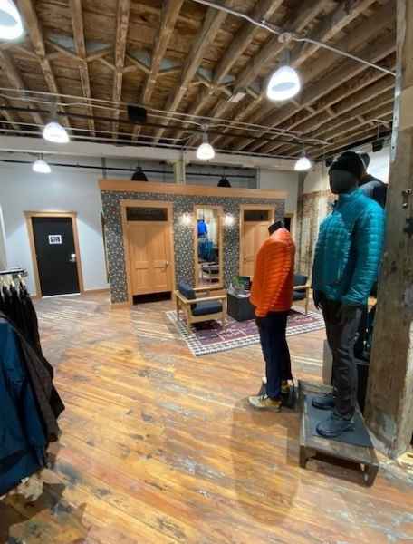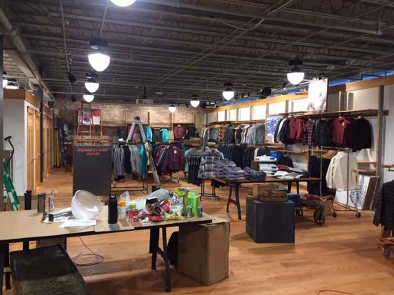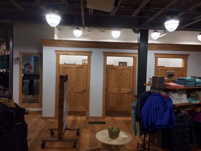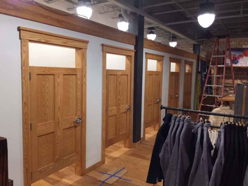 - Custom Millwork buildout in an industrial outdoorsy style, for fitting rooms, trim, cash wrap, displays and fixtures using reclaimed wood.