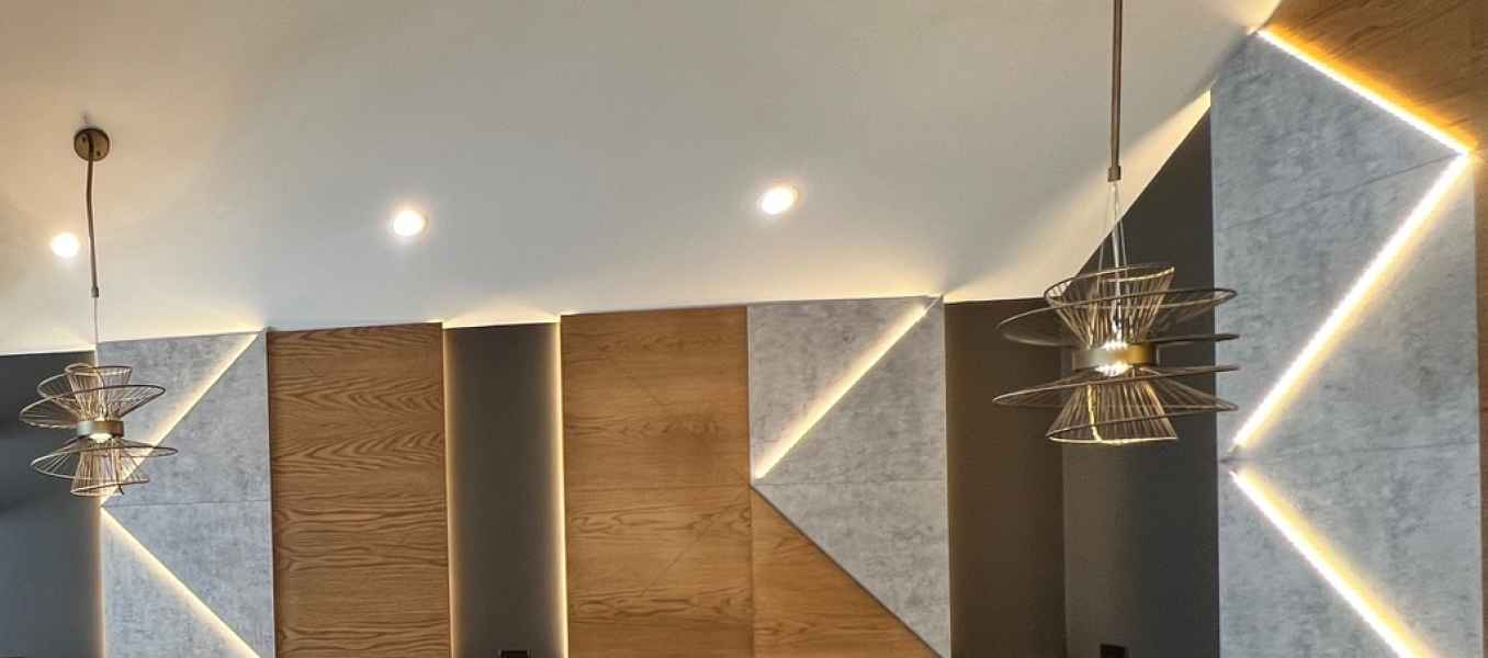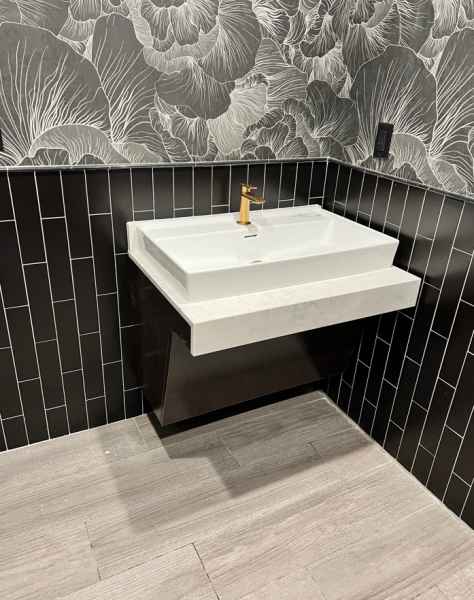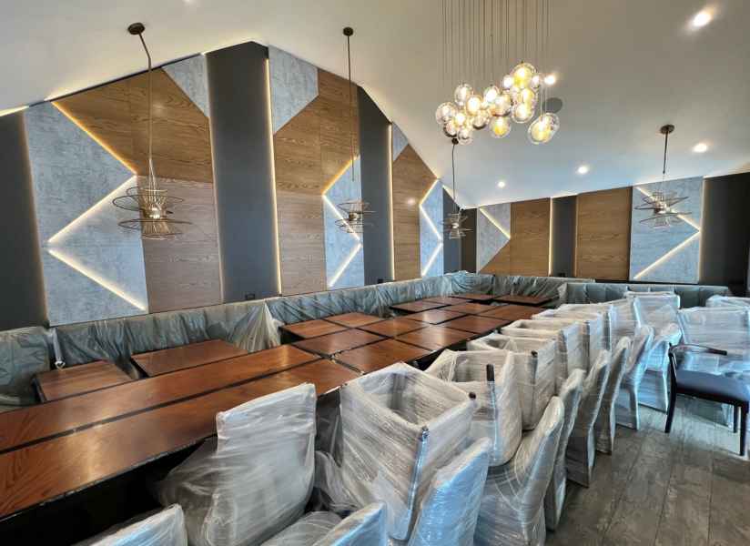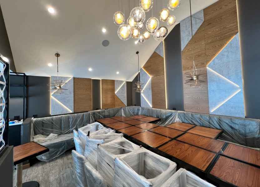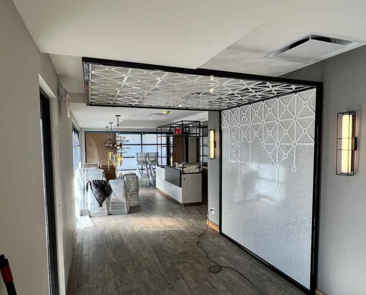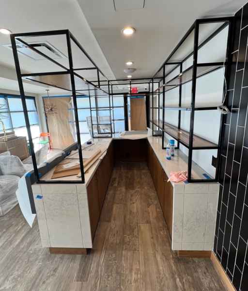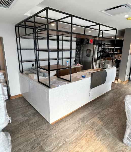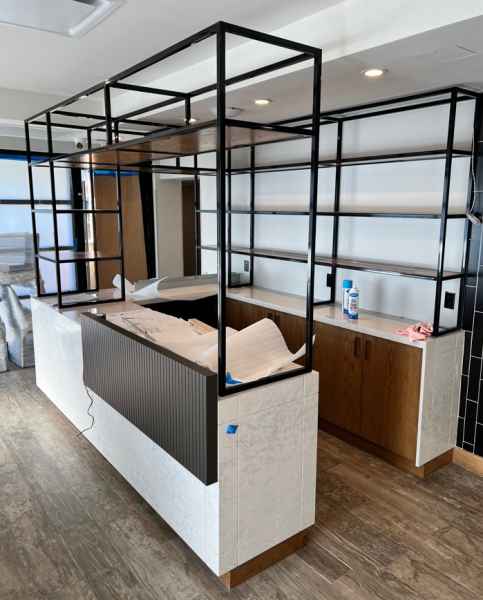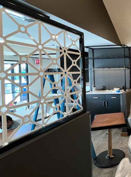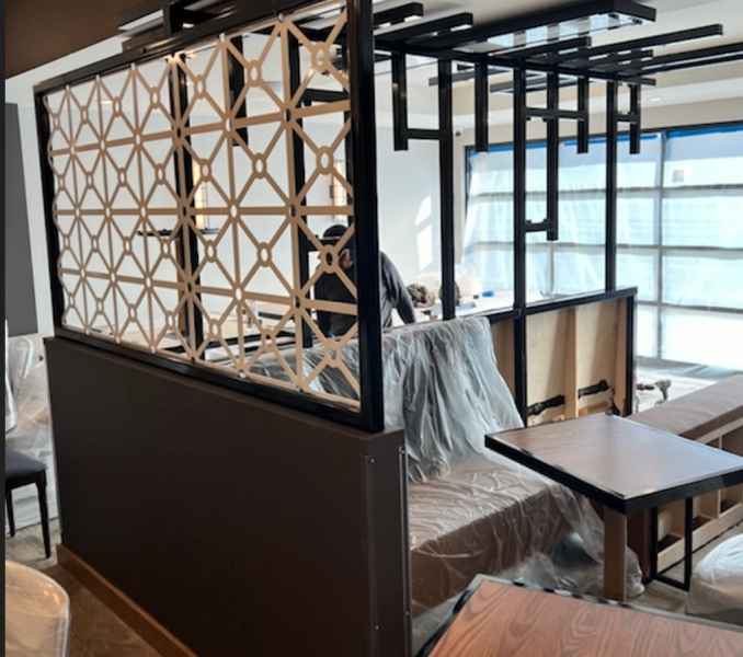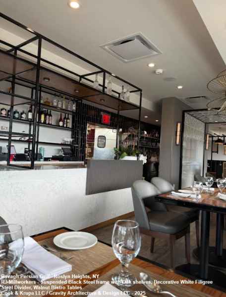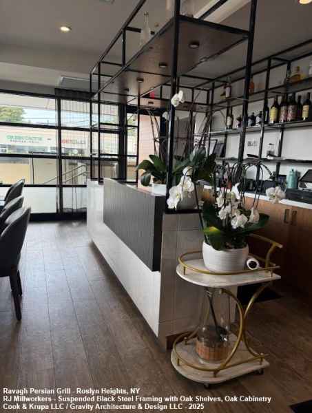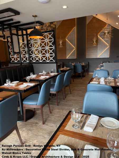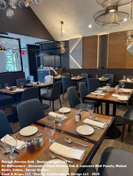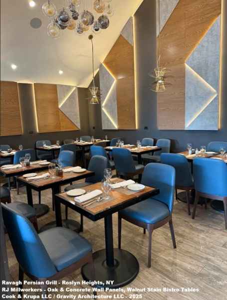 - Oak Wall & Concrete Laminate Wall Paneling, Oak - Walnut stain Bistro Tables, Oak Server station, Decorative White Steel Divider, Suspended Black steel framing with oak shelves, Mahogany Wait station