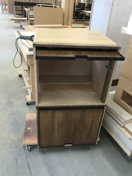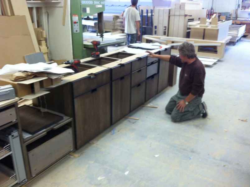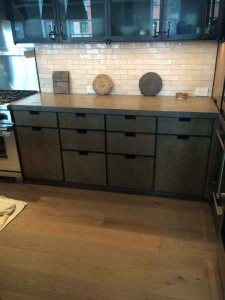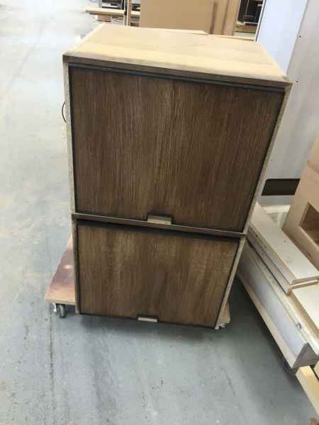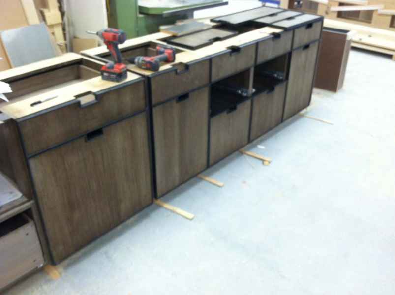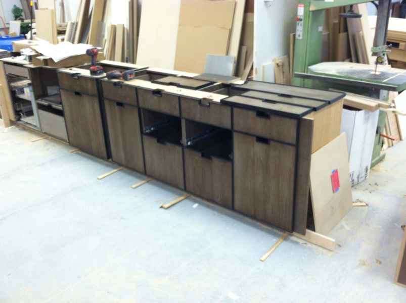 - Rift sawn white oak and Lacquer finishes with blackened metal frames and metal interiors.