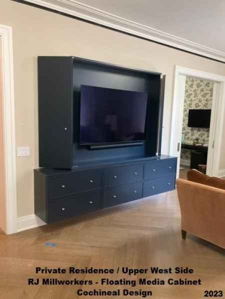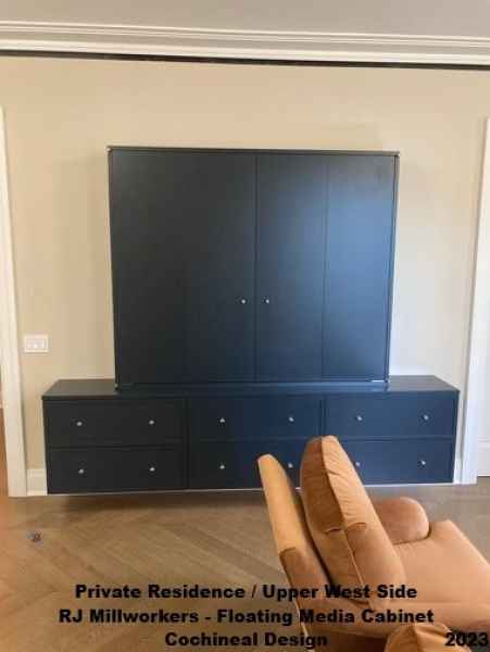 - Customized Floating oversized TV media center with bifold doors Painted Farrow & Ball Railings Blue, Custom kitchen cabinets painted Farrow & Ball London Stone with reeded glass inserts, Custom built in bookcase painted Farrow & Ball London Stone.